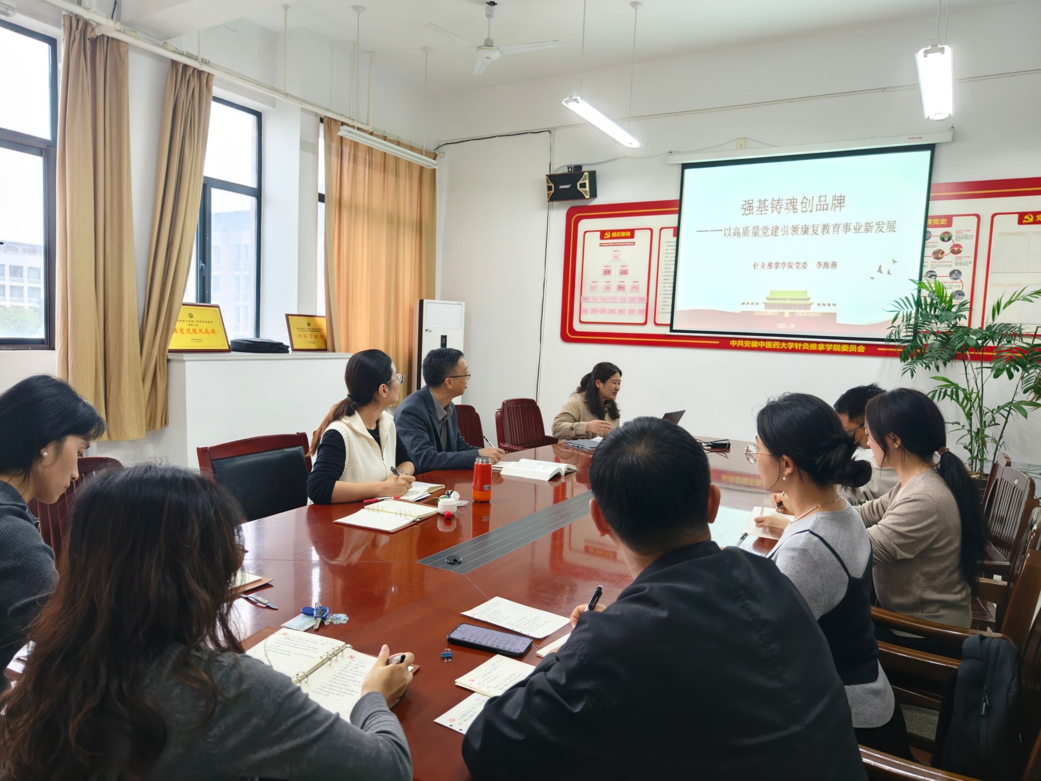 随后,李海燕作了题为《强基铸魂创品牌——以高质量党建引领康复教育事业新发展》的专题党课。李海燕从抓党支部标准化与品牌建设的必要性、支部标准化建设路径建议、品牌创建方案探讨、凝聚共识共促发展四个方面展开。她强调党支部标准化建设是基础,品牌建设是特色,把标准化要求落到实处,才能让品牌特色彰显活力,以高质量党建引领康复养生系各项工作再上新台阶。