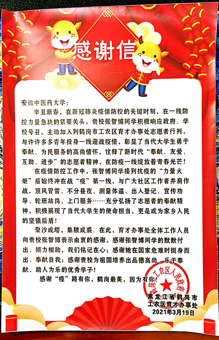 2021年寒假期间,2019级针灸推拿学专升本班张智博就是许许多多疫情防控志愿者中的一员,假期返乡后积极响应政府号召,主动加入到黑龙江省鹤岗市工农区育才办事处志愿者行列,积极投身到疫情防控第一线,为当地疫情防控工作做出努力和奉献。