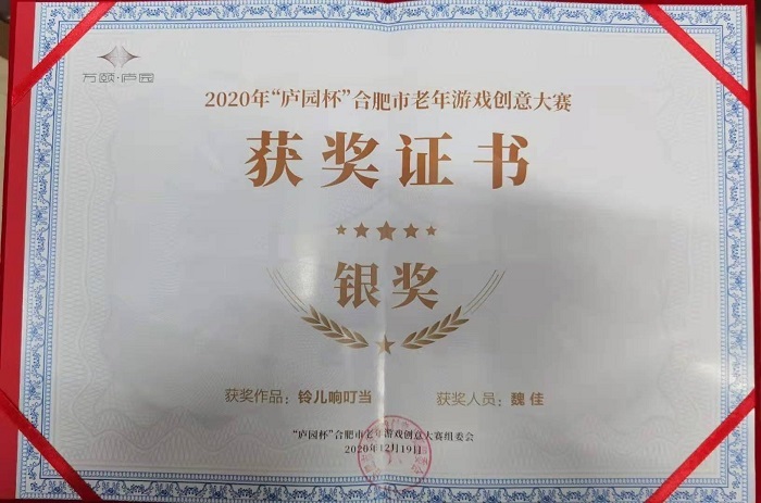 为老设计、为爱行动、为玩创意。12月19日,由合肥市民政局、安徽省社会工作者协会指导,万颐·庐园长者照料中心主办的2020“庐园杯”合肥市老年游戏创意大赛结果揭晓,2020级康复治疗学1班魏佳同学设计的《铃儿响叮当》荣获本次大赛银奖。