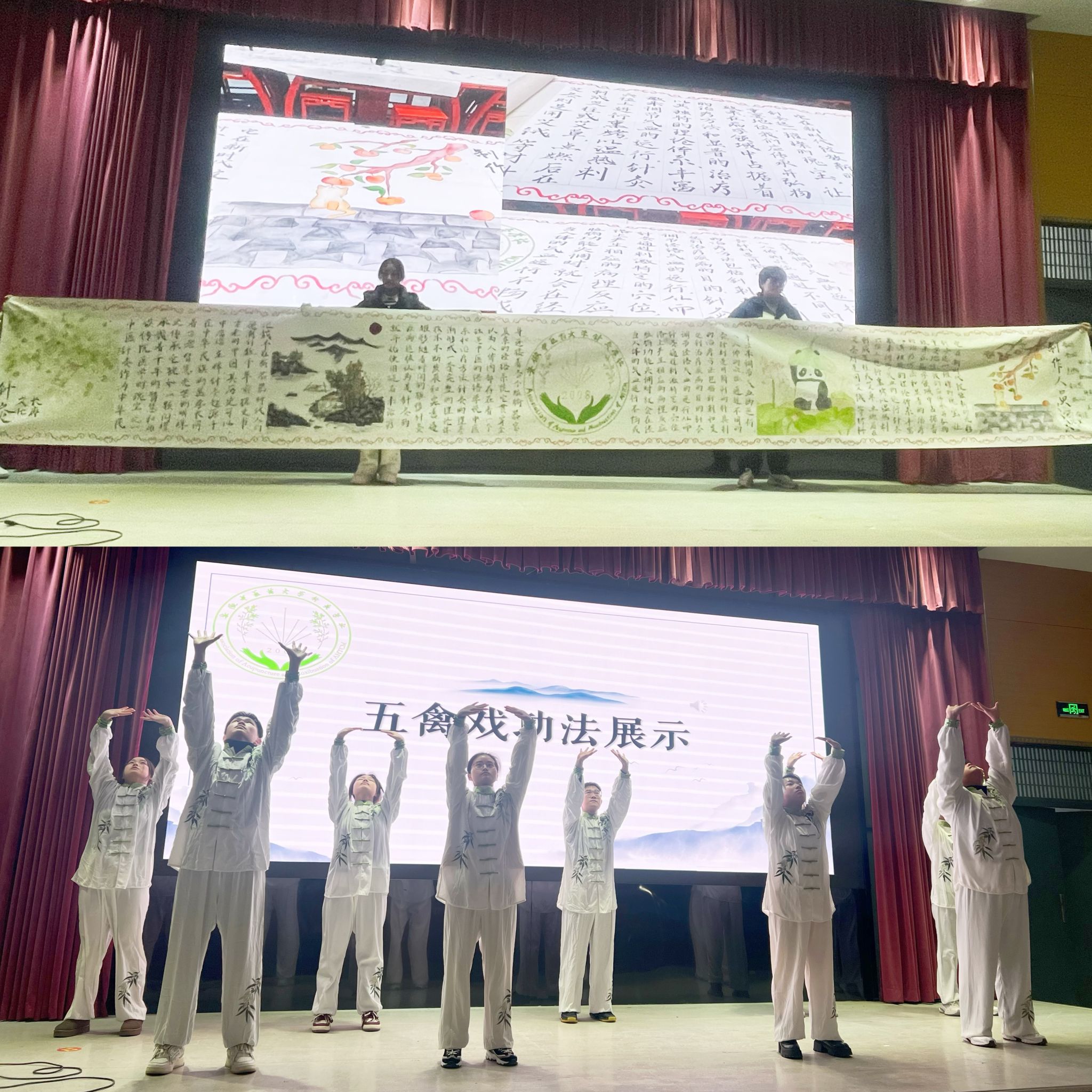 老员工针灸学社社长王苗苗进行针灸学社年度工作总结,汇报了学社特色活动开展情况。随后,针灸学社进行了针灸器具展示、针灸文化长廊卷轴展示、以及健身气功五禽戏表演。丰富的活动内容引发现场阵阵掌声。