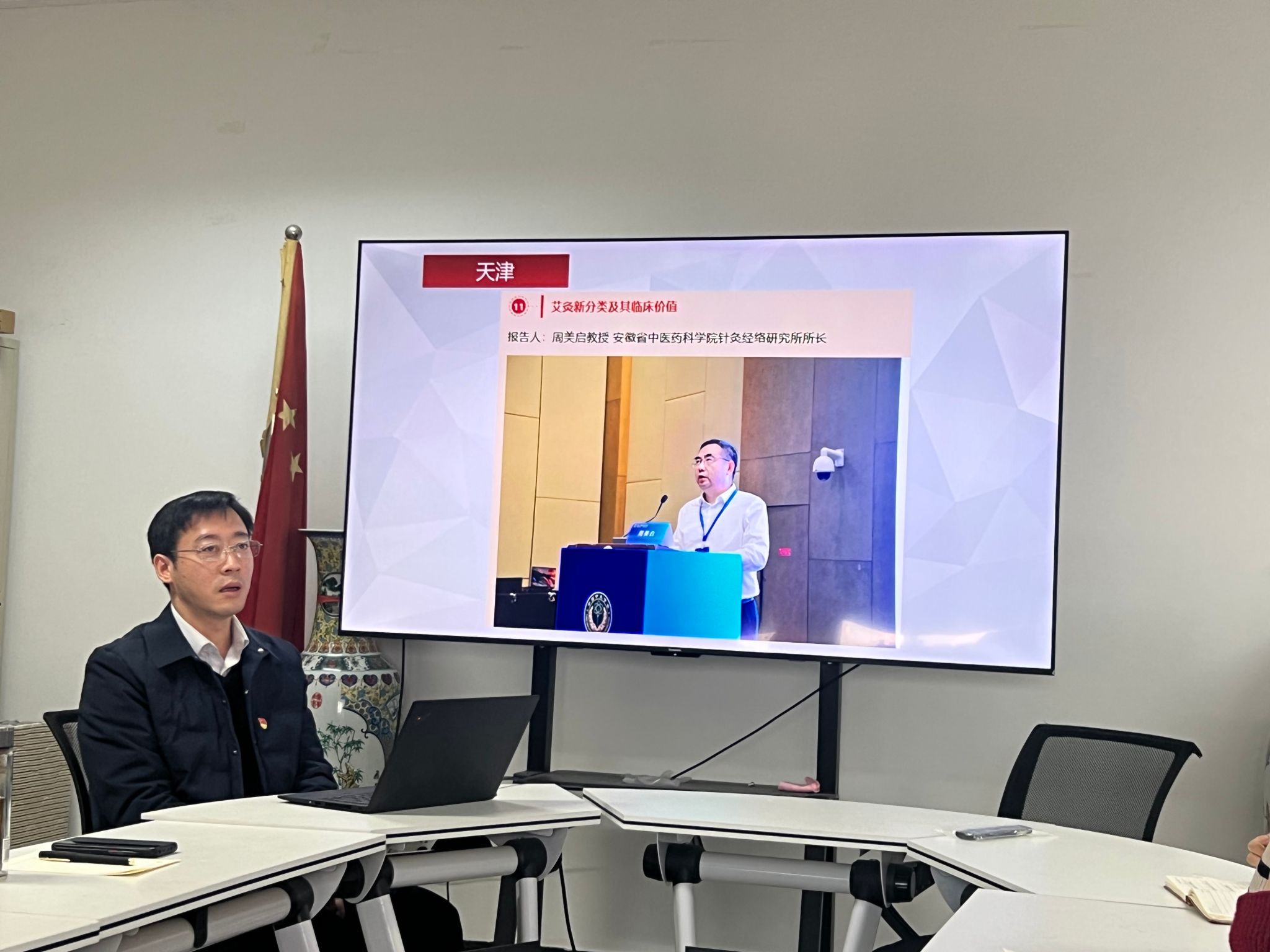 教工第一党支部吴生兵老师开展以“习近平考察安徽重要讲话精神学习体会”为主题的微党课,他从“深化改革”和“传承创新”两个角度展开分享,并结合课题组艾灸相关科研现状,同与会教师探讨艾灸的传承、创新发展。
