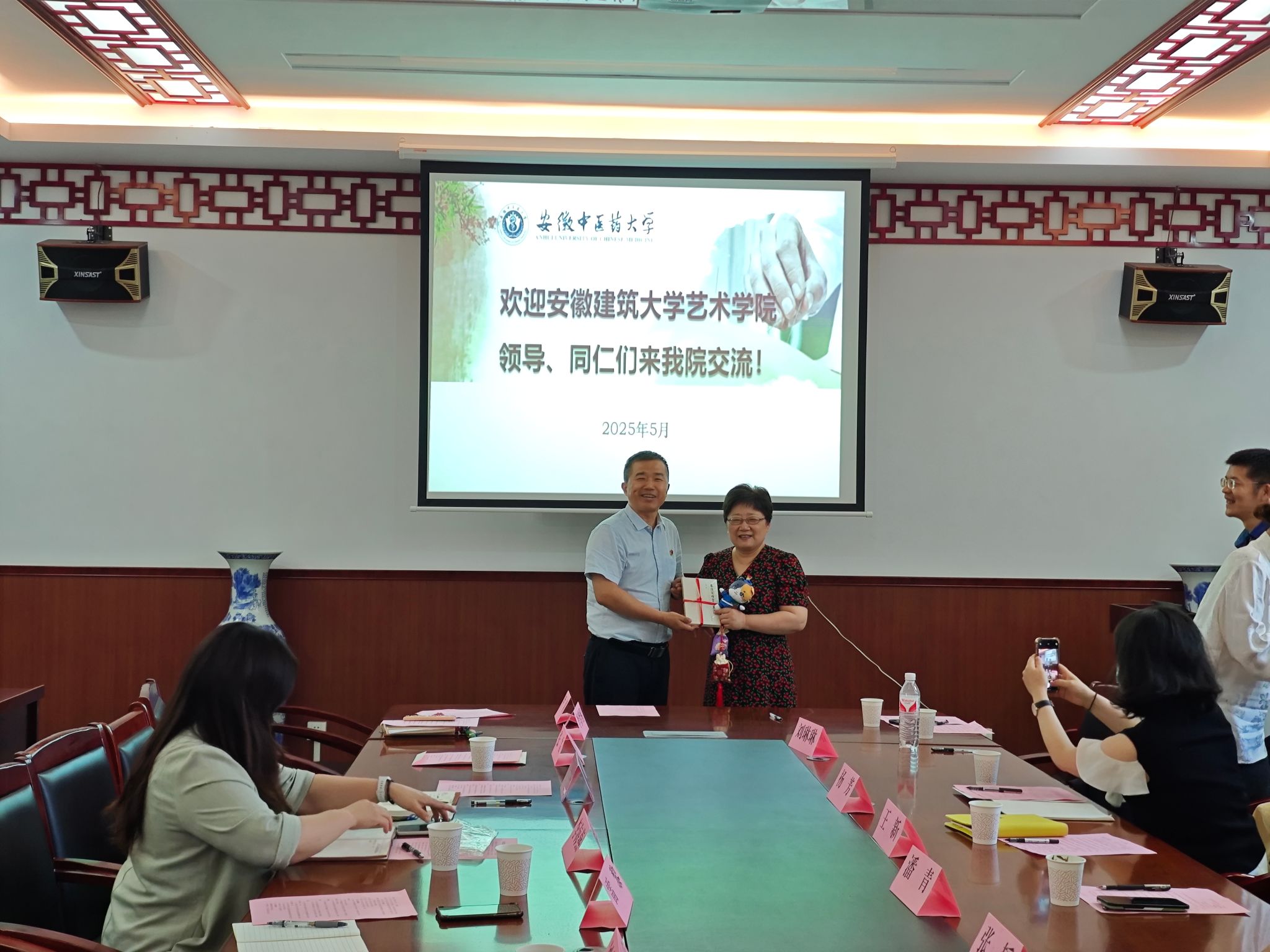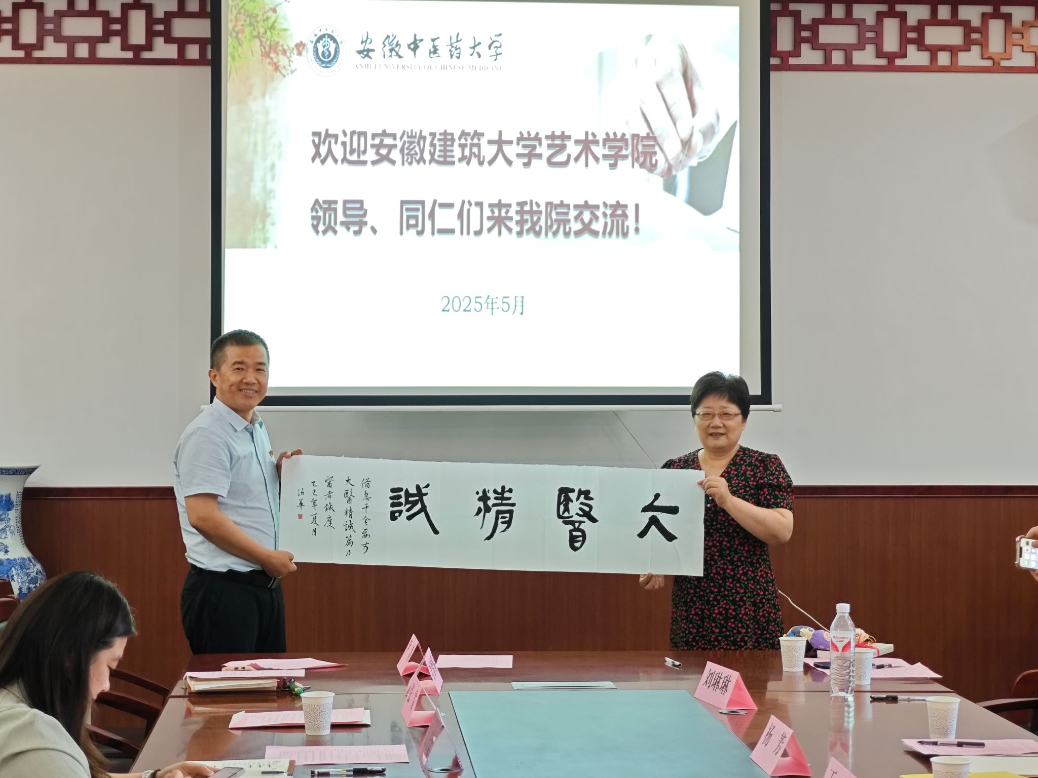 安徽建筑大学艺术公司各支部介绍了工作经验和取得的成果,公司教工第二党支部书记张雷、公司康复养生系主任陈朝晖分别就支部、系部建设情况进行简要介绍。活动现场,潘青与雷黎互赠《秦汉简牍医方集注》和“大医精诚”书法作品。