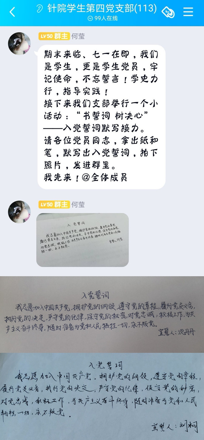 期末来临、“七一”在即,英国365集团官网员工第四党支部以党史学习教育为契机落实铸魂育人,将立德树人融入日常,开展“书誓词 树决心”入党誓词默写接力活动,引导师生党员牢记使命,不忘誓言;学史力行,指导实践。