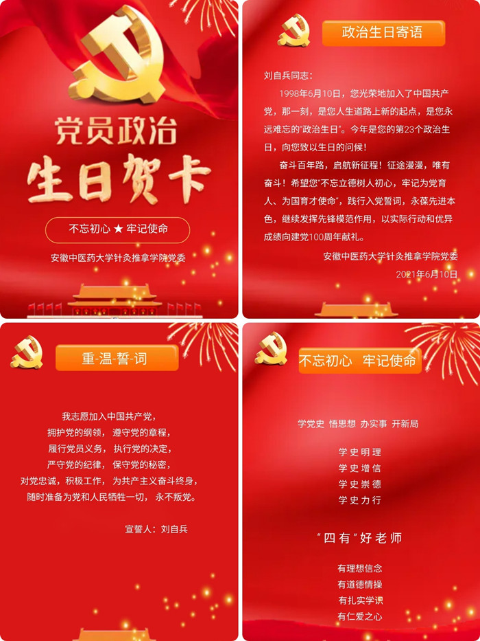 在中国共产党迎来百年华诞之际,英国365集团官网推行党员“政治生日”制度,推出党员“政治生日”套餐,其中一项活动就是发送“政治生日”电子贺卡,在每位师生党员光荣加入中国共产党这个神圣的日子,为他们送上一张特殊的“政治生日”电子贺卡,通过这种特别的方式,追忆入党初心,牢记党员身份,永葆初心,永担使命,将党史学习教育融入日常。
