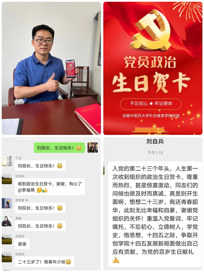 "入党的第二十三个年头,人生第一次收到组织的政治生日贺卡,隆重而热烈,甚是惊喜激动,同志们的问候也很及时而真诚,真是别开生面啊,想想二十三岁,我还青春韶华,此刻无比幸福和自豪,谢谢党组织的关怀!重温入党誓词,牢记嘱托,不忘初心,立德树人,学党史,悟思想,“十四五”之际,争取开创公司十四五发展新局面做出自己应有贡献,为党的百岁生日献礼”刘自兵生日感言激动而自豪。