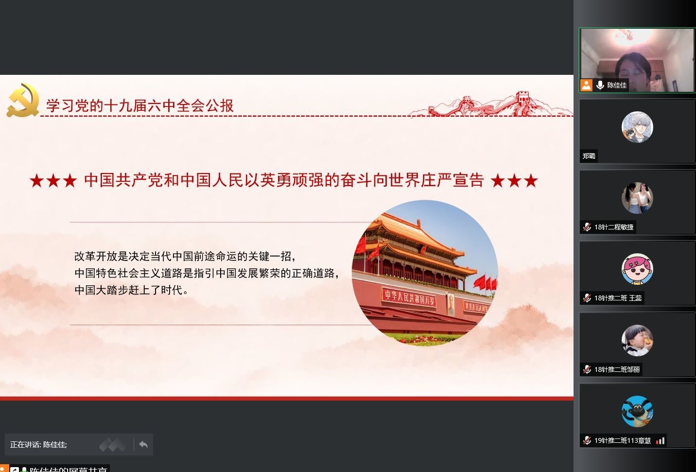 会议第二项,进行组织生活会,支部党员结合前期所发文件要求进行批评与自我批评。会议第三项,由陈佳佳带领全体支部党员学习党的十九届六中全会公报,贯彻党的十九届六中全会精神,陈佳佳补充道:“结合支部每月时政热点学习活动,线上线下联动,将党的学习落实到实处”。最后开展毕业党员就业动员与政策进行宣讲。陈佳佳强调要向优秀党员学习,发挥党员的先锋模范作用,尤其在毕业季,毕业班党员需要主动对接,热诚帮扶未就业同学,真正做到为人民服务。