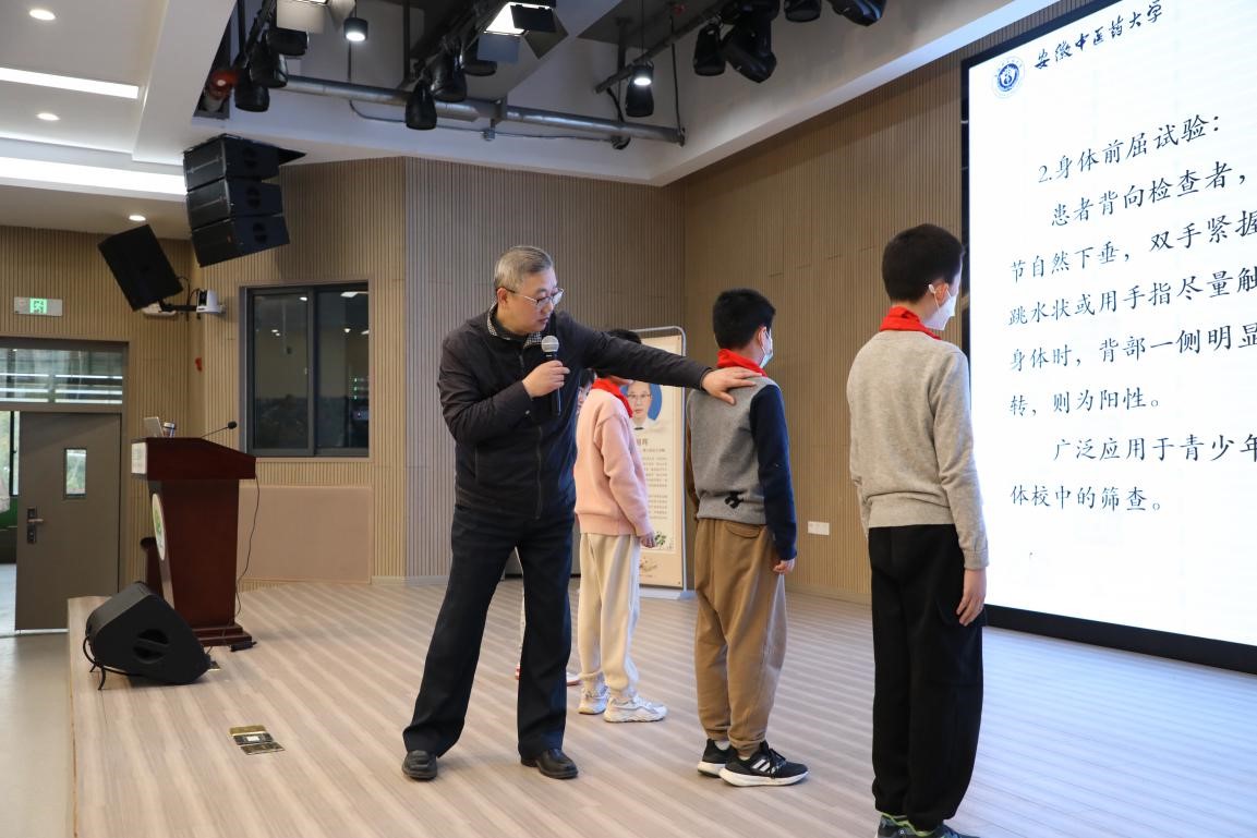 陈教授邀请小员工代表上台互动,演示如何在日常生活中发现和检测脊柱侧弯,指出小员工们要在在日常学习和生活中注意端正坐姿、立姿、睡姿和行姿,小员工们积极与陈教授进行互动。