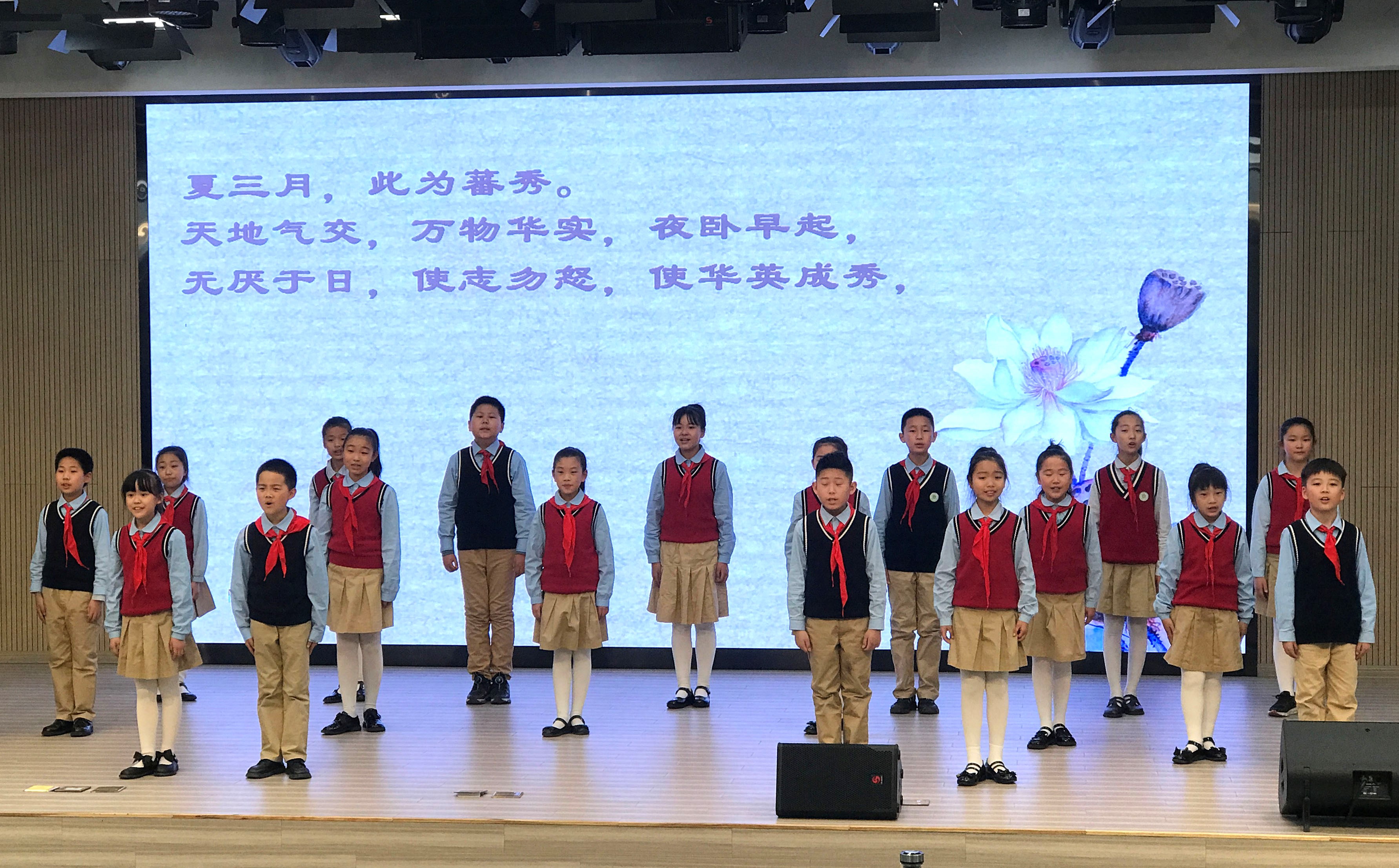报告会后,望湖小学的经典诵读队进行了中医经典《黄帝内经》诵读汇报。在蒋宏杰老师的指导下,望湖小学老师指挥小员工们诵读《素问·四气调神大论篇》,孩子们在声情并茂的诵读中,体会着中医四季养生的智慧。