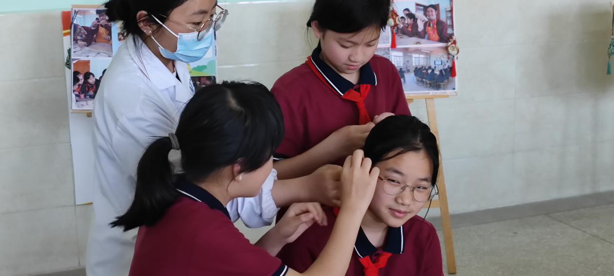 王洁老师和老员工志愿者们教同学们如何认耳穴,手把手教孩子们敷贴耳穴,孩子们兴趣盎然,纷纷互相在同学耳朵上贴豆练习。