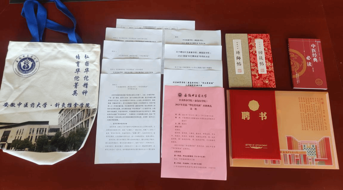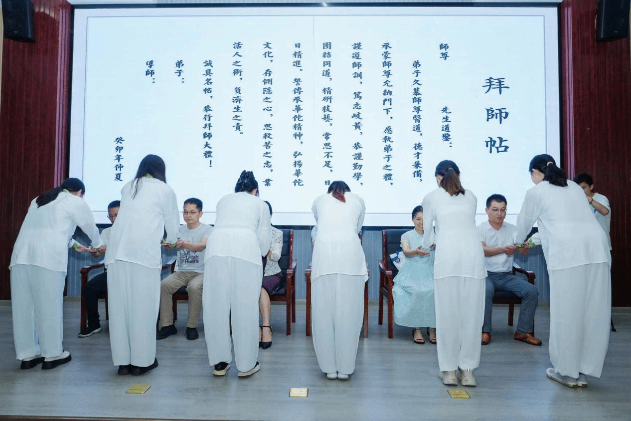开班仪式结束后,举行了传统、隆重、简朴的拜师典礼。“华佗菁英班”导师代表和员工代表,依次互呈拜师帖、回徒帖,导师将中医经典装入特别设计的“华佗青囊”里,寓意将精诚品德和知识技艺“倾囊而授”,希望弟子们传承华佗衣钵,成为未来针灸推拿行业的青年主力军。