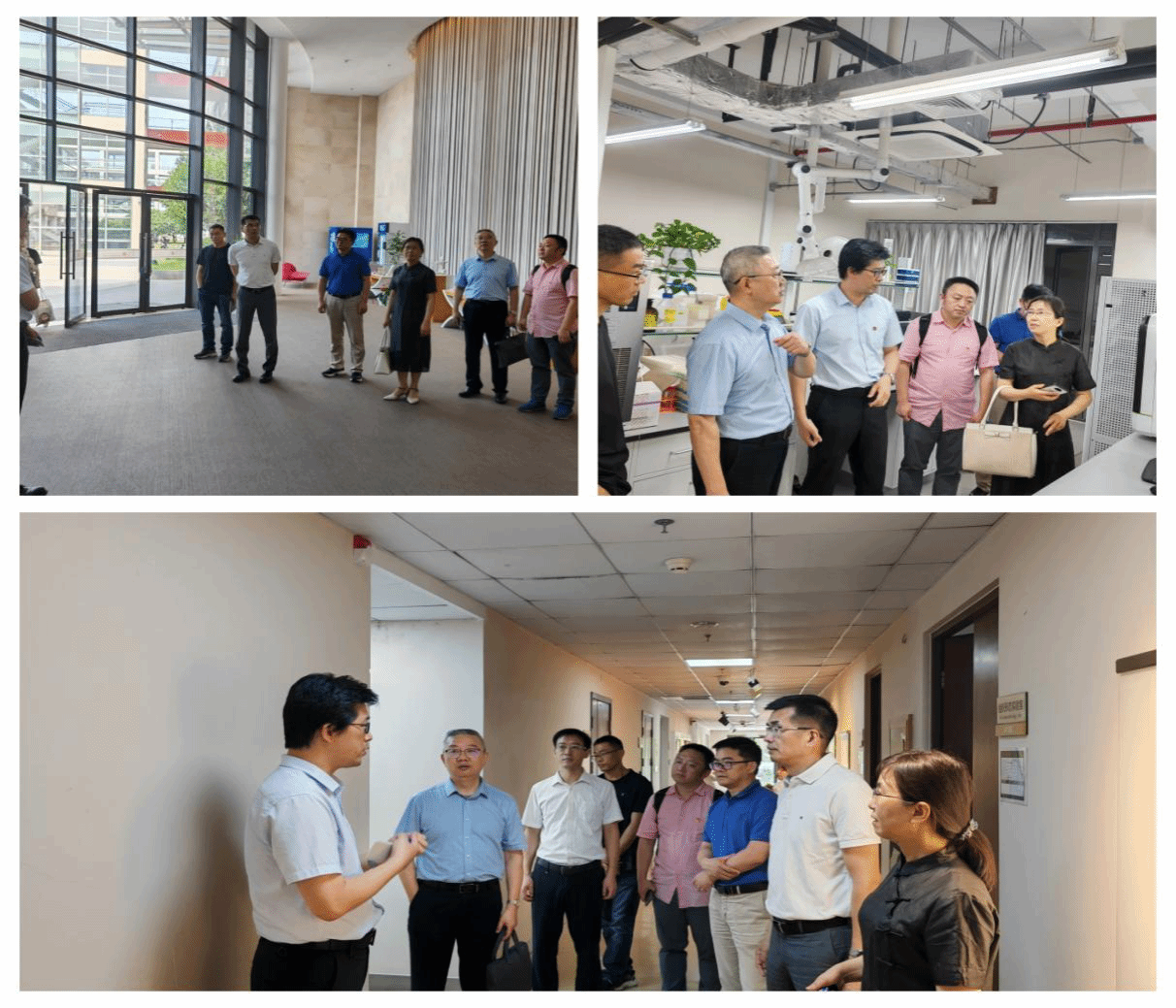 在上海中医药大学科技创新中心,中心主任王宇带领蒋宏杰一行,先后参观了各大实验室和科研成果展示墙,介绍了中心的科研仪器设备配置与管理、开放制度,公司党政办主任袁培陪同参观。