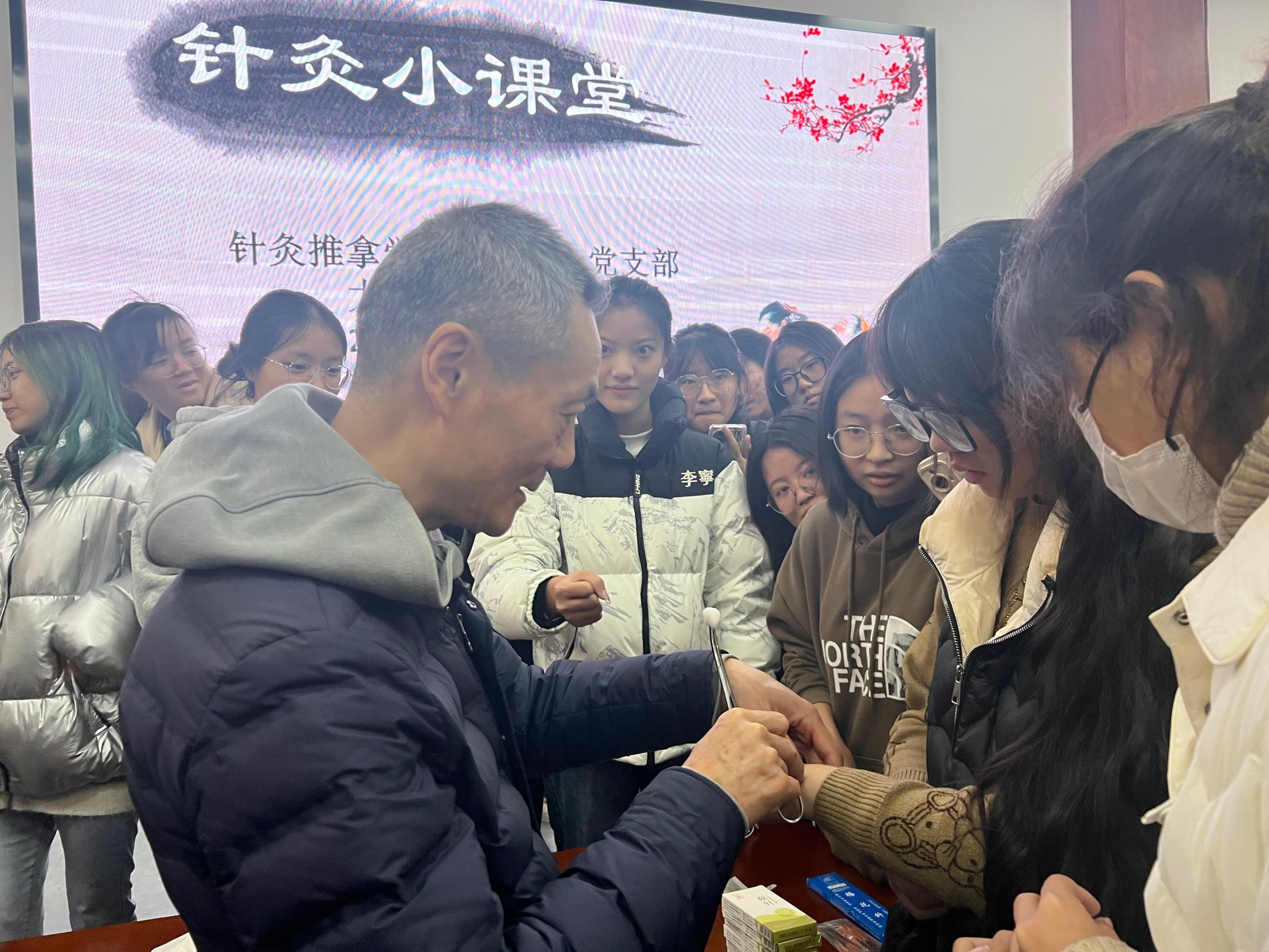讲座后,陈卫华为现场同学们开展体验针灸,同学们争先恐后,跃跃欲试,对针灸的神奇以及陈老师的针刺操作叹为观止。