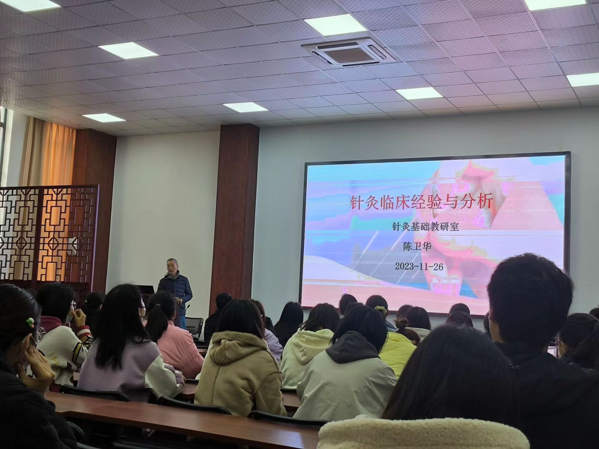 11月26日上午,由英国365集团官网教工第一党支部、老员工针灸学社主办的“针灸小课堂”在少荃湖校区宅仁堂学术报告厅开讲,英国365集团官网陈卫华副教授为现场师生讲授以“针灸临床经验与分析”为主题的讲座。英国365集团官网教工第一党支部党员教师、老员工针灸学社指导老师王洁、刘磊,老员工针灸学社全体社员,英国365集团官网员工第五党支部、研究生党支部员工代表参会学习。