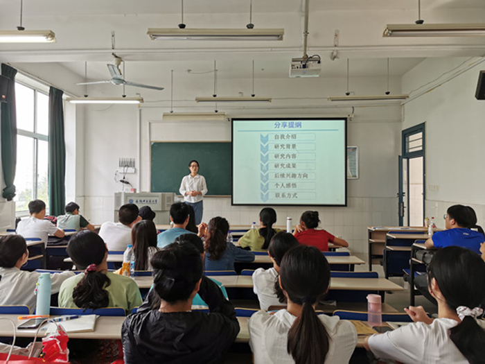 沐彩云从钛合成材料研究背景、研究内容、研究成果、后续方向及个人感悟等方面,通过科研图表数据,从疗效检测、材料表征、药物释放等多角度为新生介绍了科研实验方法与技术。通过介绍前沿科技开阔了新生的学术视野,帮助新生了解有关实验技术和研究热点。同时,结合自身科研经历,建议研究生新生尽早进行学术生涯规划,珍惜时间,走出舒适区,严格要求自己,实现人生价值,无悔青春韶华。