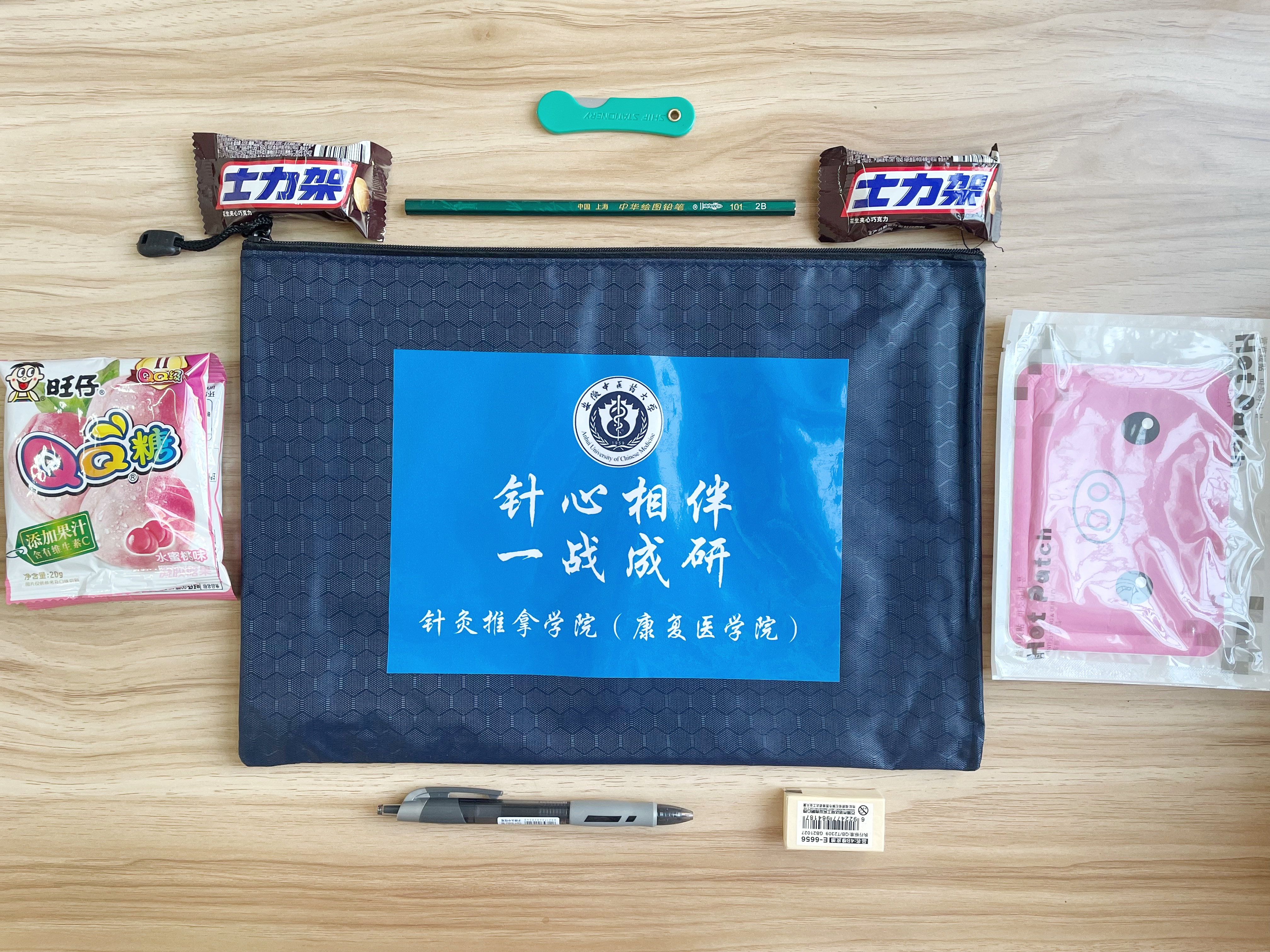 公司为每一位考研学子精心准备了“针爱暖心包”,内含“下笔如有神,考研一定成”文具套餐——黑色水笔、2B铅笔、橡皮、美工刀等考试专用必备文具,还有“给你力量,勇攀彼岸”的能量士力架、“温情相伴,研途温暖”的爱心暖宝宝贴,更有“人旺、身体旺、考运旺”的旺仔QQ糖。
