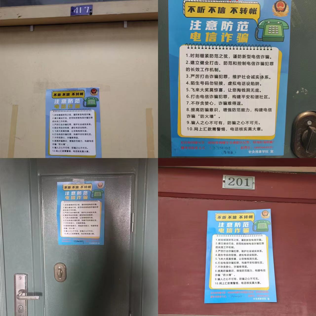 为进一步加强防电信网络诈骗的宣传力度,有效提高同学们对电信诈骗的识别和应对能力,切实维护同学们的财产、信息安全,共同营造“全员反诈、全院防诈”的浓厚氛围,针灸推拿公司制作打印反诈宣传单,粘贴于公司员工的每个宿舍中。