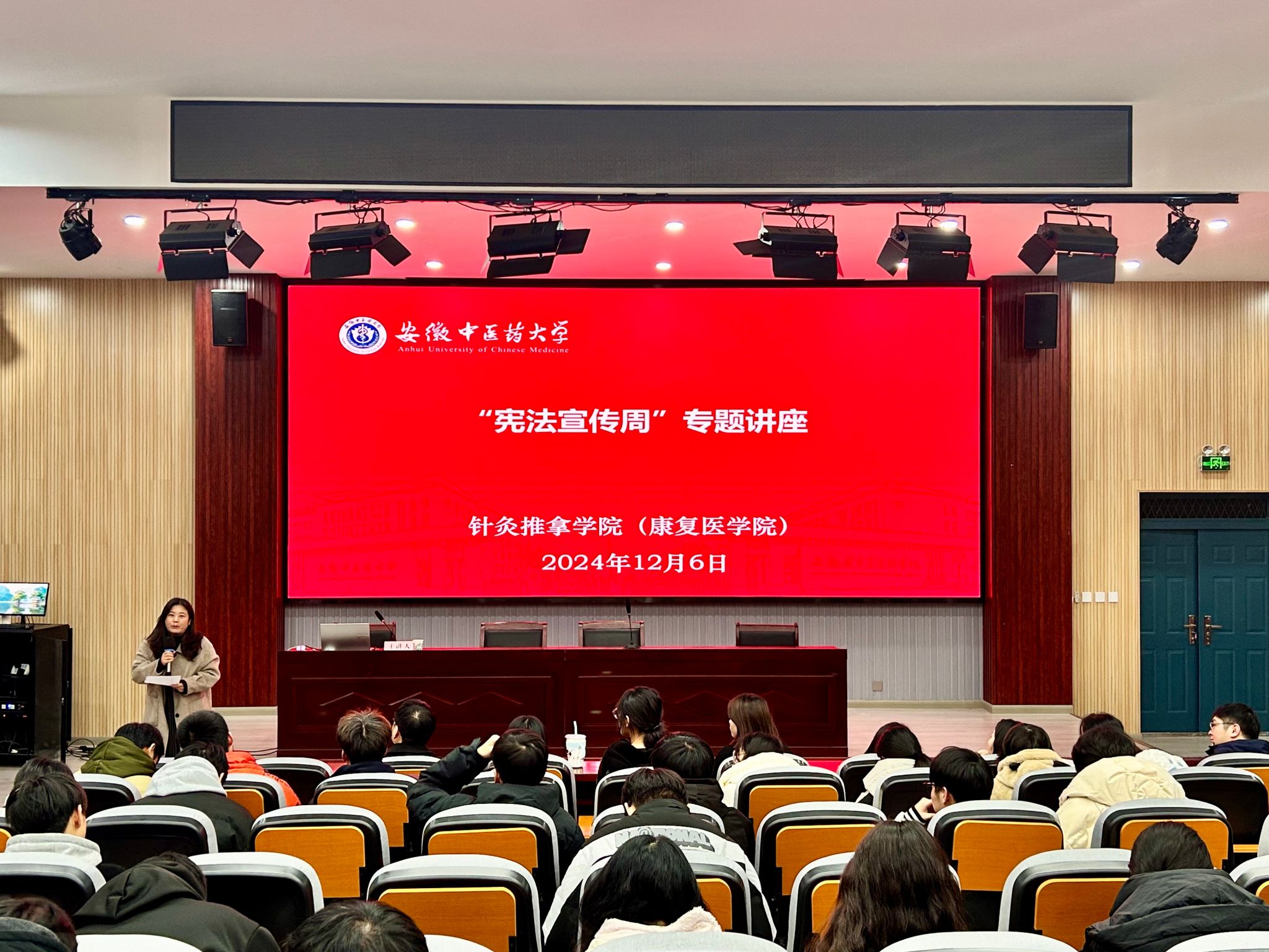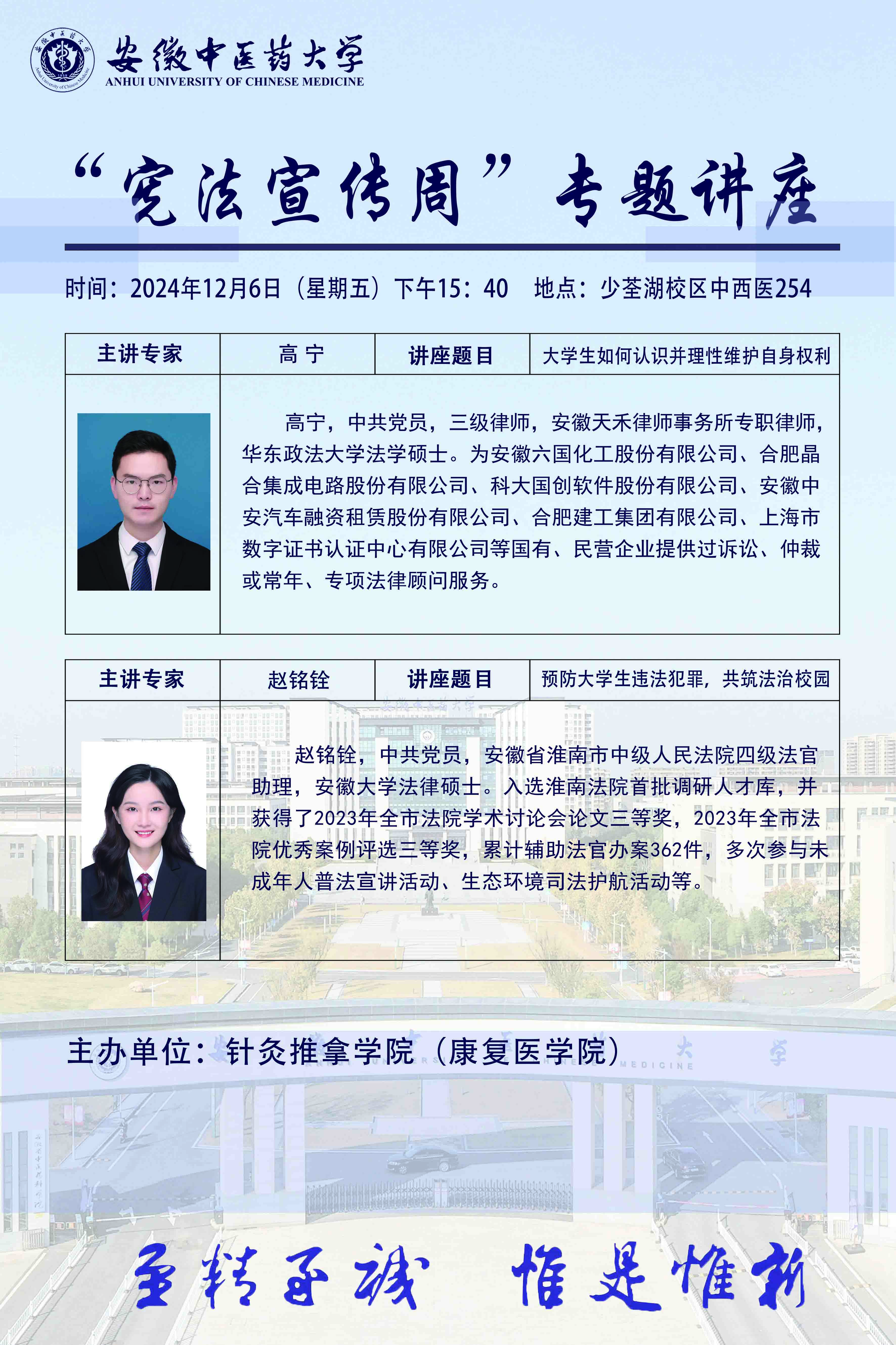 为深入学习宣传贯彻习近平法治思想,大力弘扬宪法精神,加强宪法法治教育,切实增强师生法律意识,针灸推拿学院于12月6日邀请安徽省淮南市中级人民法院四级法官助理赵铭铨、安徽天禾律师事务所专职律师高宁面向公司师生开展“宪法宣传周”专题讲座及法律咨询服务。公司党委副书记李海燕、全体辅导员及员工代表参与活动。