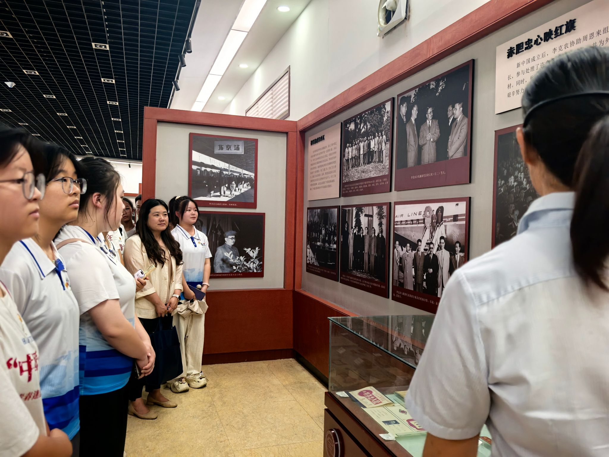 追溯“龙潭”印记,筑牢信仰之基。为深入贯彻中央八项规定精神学习教育,进一步增强党员师生廉洁自律意识,筑牢信仰之基,英国365集团官网暑期“三下乡”社会实践团队在7月4日组织师生党员前往安徽省廉政教育基地之一的李克农故居开展红色教育。师生依次参观李克农将军故居与生平事迹陈列馆。在陈列馆内,泛黄的电报机、密写药水瓶、潜伏时期的手稿等200余件珍贵文物,生动还原了这位“从未带兵打仗的开国上将”在隐蔽战线的生死斗争。“看到将军用过的破旧皮箱和密电原件,我才真切体会到什么是‘于暗夜中护光明’!”员工党员付挺远感叹。