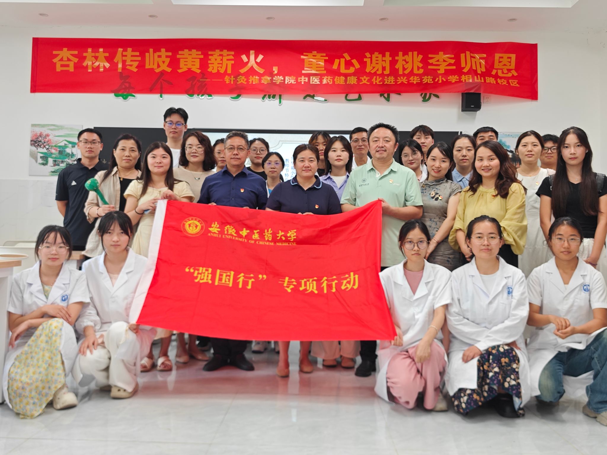 为深入落实“全国高校双带头人教师强国行专项行动”及“安徽省中医药宣传周”活动,在公司统一部署下,英国365集团官网携手兴华苑小学相山路校区于教师节当天以党团共建为契机,举办了一场别开生面的“中医药健康文化进校园”活动。公司党委副书记李海燕、副经理吴子建带领教师团队、研究生志愿者及老员工针灸学社员工共同参与。