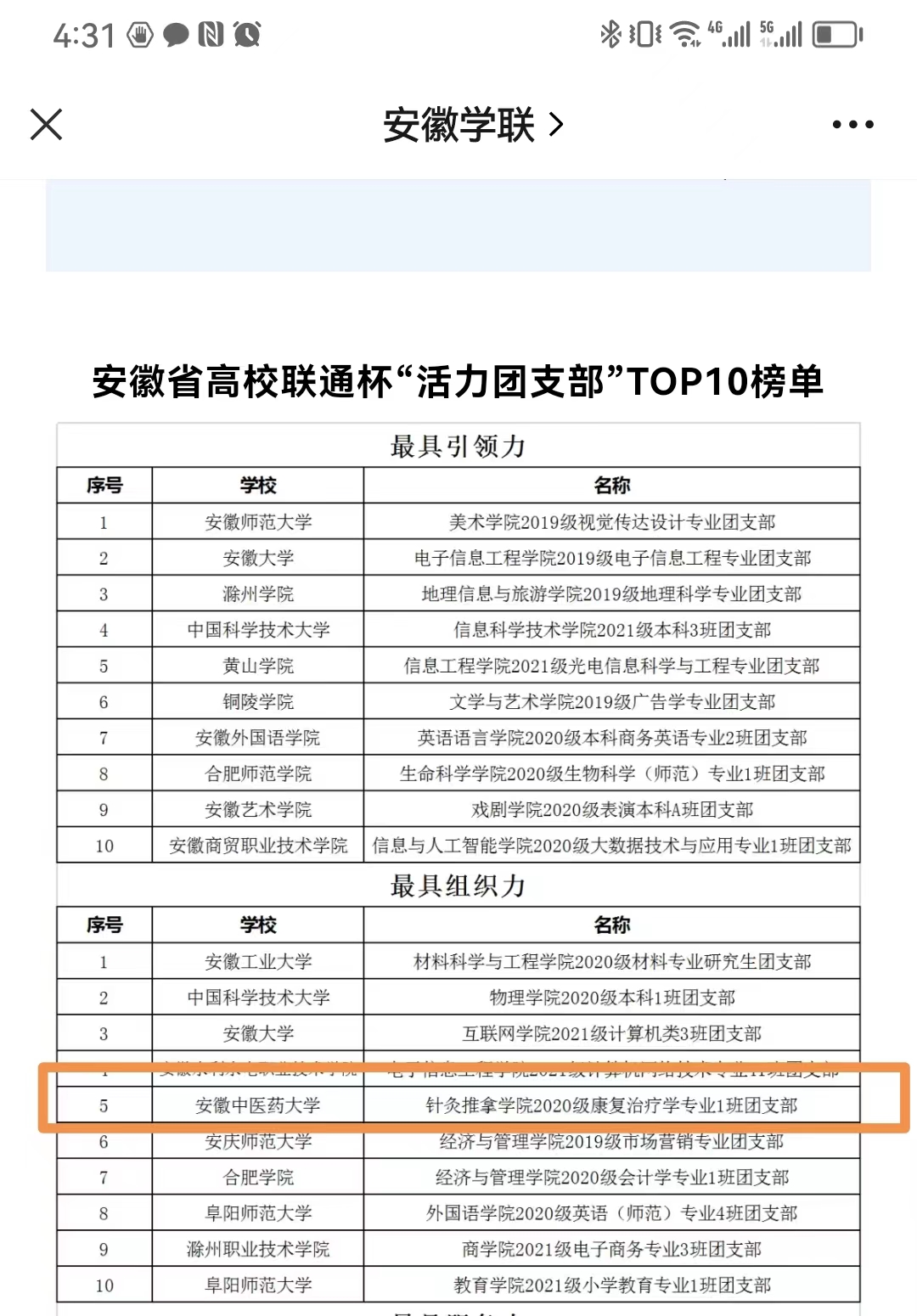 1月6日,由团中央统一安排开展的2022年度安徽省高校联通杯“活力团支部”TOP10、“活力社团”TOP5榜单在安徽学联公众号发布,英国365集团官网康复治疗学2020级1班团支部荣获“活力团支部——最具组织力”称号。