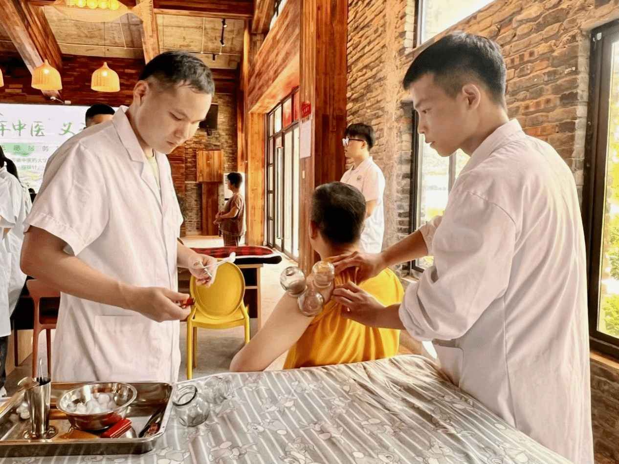 每天早上8点,团队队员就在马郢村新时代文明服务站集合到位,积极布置横幅、搬运桌椅、摆放器材等,之后明确分工,为村民们开展针灸、推拿、拔罐、耳穴贴压等中医义诊服务。9点,闻讯而来的村民们陆续到达,在志愿者的引导下,按照顺序在场等候。身穿白大褂的队员们一边为村民量血压、测血糖、推拿、针刺、艾灸、拔罐、刮痧、贴耳穴,一边耐心询问村民的身体状况,并根据村民的不同情况提供一些健康指导意见。