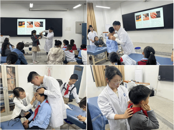 最后,志愿者带领望湖学子来到了英国365集团官网二楼实验实训教室,英国365集团官网教师齐亚军、四位参加全国针灸技能大赛的同学为望湖学子讲解和演示针刺、拔罐、推拿、按揉穴位的手法,重点向同学们介绍了眼保健操和促进儿童身体长高的相关穴位。