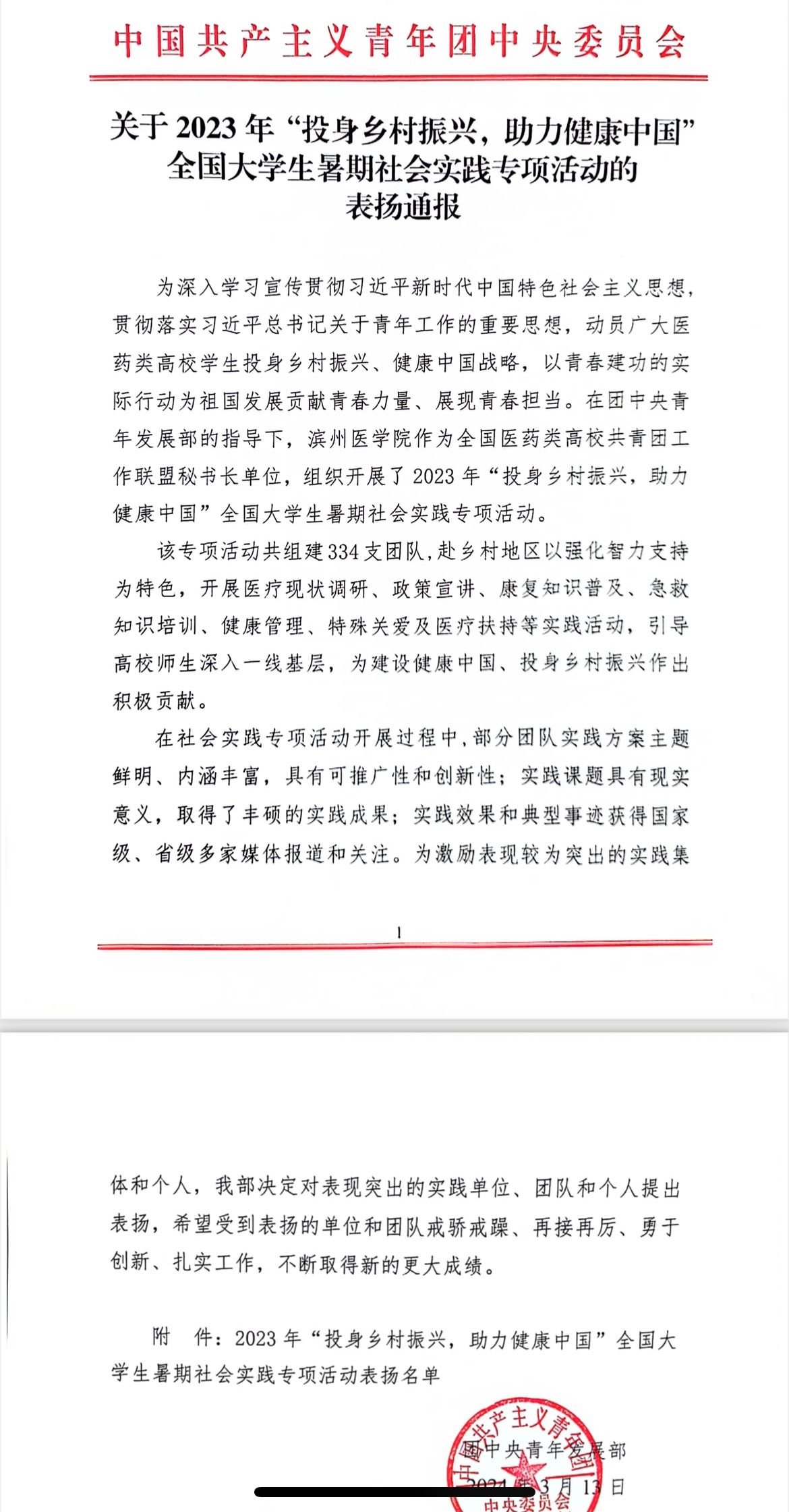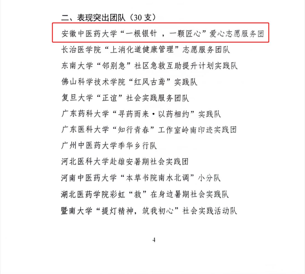 近日,团中央青年发展部下发《关于2023年“投身乡村振兴,助力健康中国”全国老员工暑期社会实践专项活动的表扬通报》,英国365集团官网“一根银针,一颗匠心”爱心志愿服务团获“表现突出团队”荣誉称号。