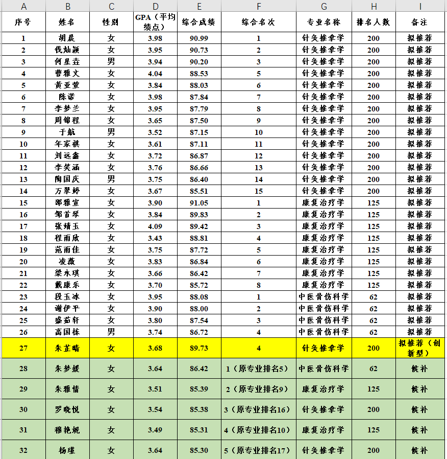 注:候补人选排序原则,均按照综合成绩,第1轮,由各专业排名第一的候补人选进行排序;第2轮,由各专业排名第二的同学进行排序。则候补人选排序为上表。