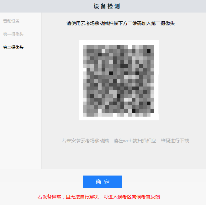 当考试要求使用双摄像头进行面试时,考生需要打开云考场移动端扫描该页面提供的二维码加入第二摄像头。