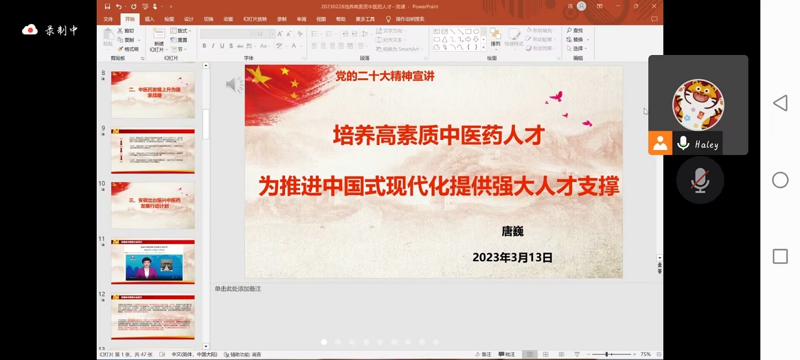 会上,唐巍作了题为《培养高素质中医药人才,为推进中国式现代化提供强大人才支撑》的专题党课。在授课中,对习近平总书记关于中医药发展重要论述进行了深刻剖析,重点解读了《中医药振兴发展重大工程实施方案》,强调中医药在疾病预防、治疗、康复等方面的独特优势,中医药从业者要将报告指出的“促进中医药传承创新发展”作为工作的根本遵循和行动指南,传承精华,守正创新,切实统一思想、统一意志、统一行动。同时结合公司“振兴中医药,建设双一流”的宏伟目标、本科公司产品审核评估工作和公司发展实际,提出对同学们的殷切期望,鼓励同学成长成才。尹鸿进行了补充宣讲,把贯彻落实党的二十大精神与青年员工的就业现状紧密结合,对应届毕业生就业实际问题进行详细解读和分析,分享历届员工的就业经验,为学子就业提供指导方向。