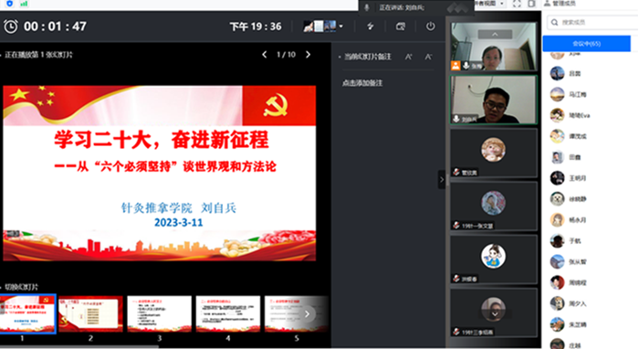 本次党课既有理论高度又有实践支撑,内涵丰富,分析透彻,使同学们深刻认识到推进健康中国建设和促进中医药传承创新发展的重大意义,激发了广老员工党员为国努力学习的积极性。(张梅/文图 蒋宏杰/审核)