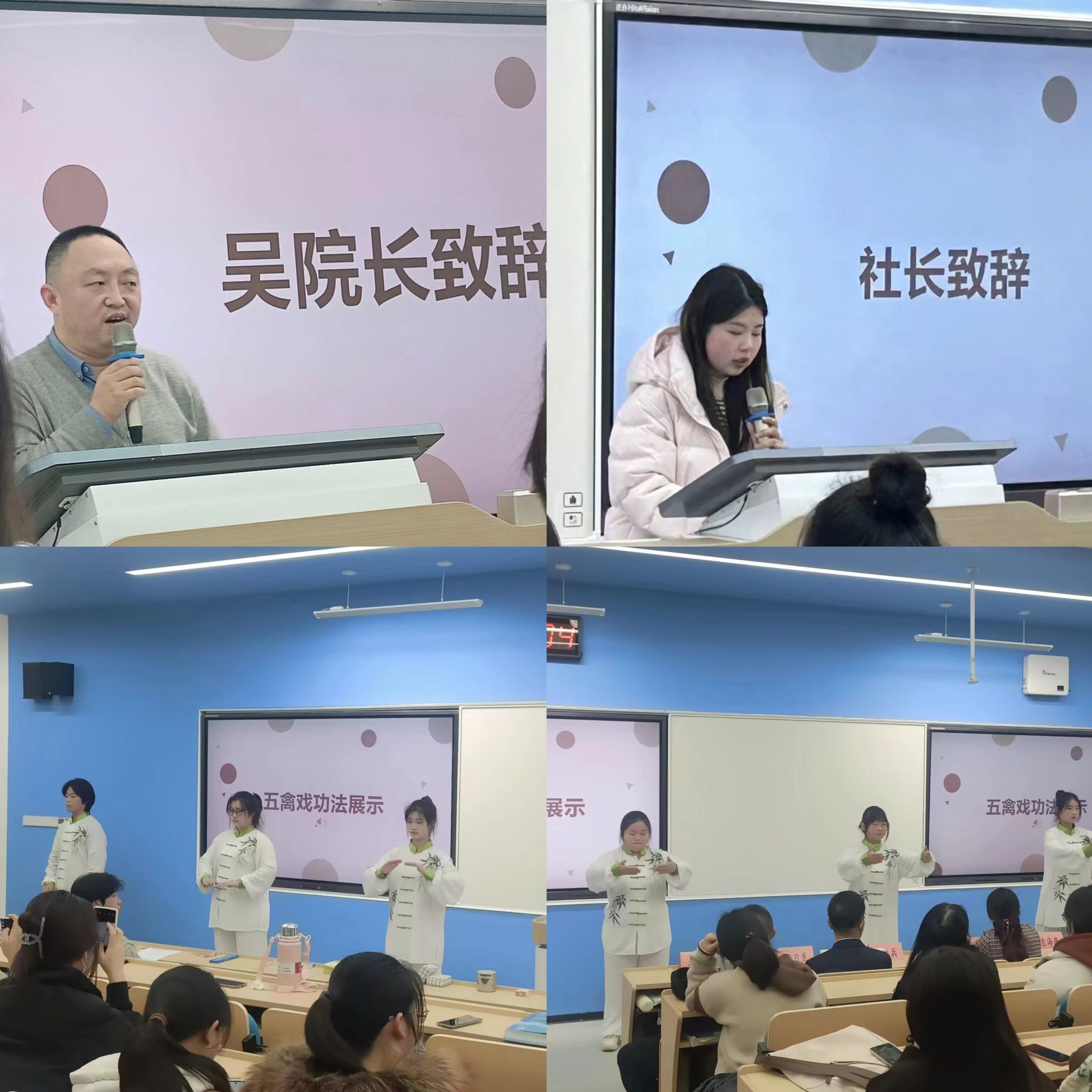 随后由针灸学社宣传部展示针灸文化长廊卷轴,并进行详细讲解。学术部成员进行了精彩的健身气功五禽戏表演。社长田欣雨详细介绍了近年来针灸学社的活动开展情况。
