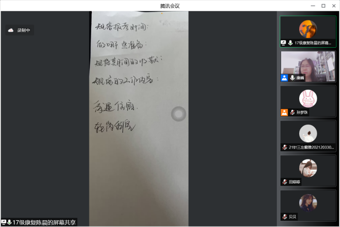 在会上,陈晨结合自身在安徽省立医院规培的经历,从规培报考时间、报考规培前准备、规培期间收获、规培期间工作内容、规培期间待遇、轮岗科室等方面详细分享了安徽省立医院康复治疗师规培的相关情况。同学们对于安徽省立医院规培招聘情况、规培报名要求、规培与考研是否冲突等问题,积极向陈晨学姐请教。