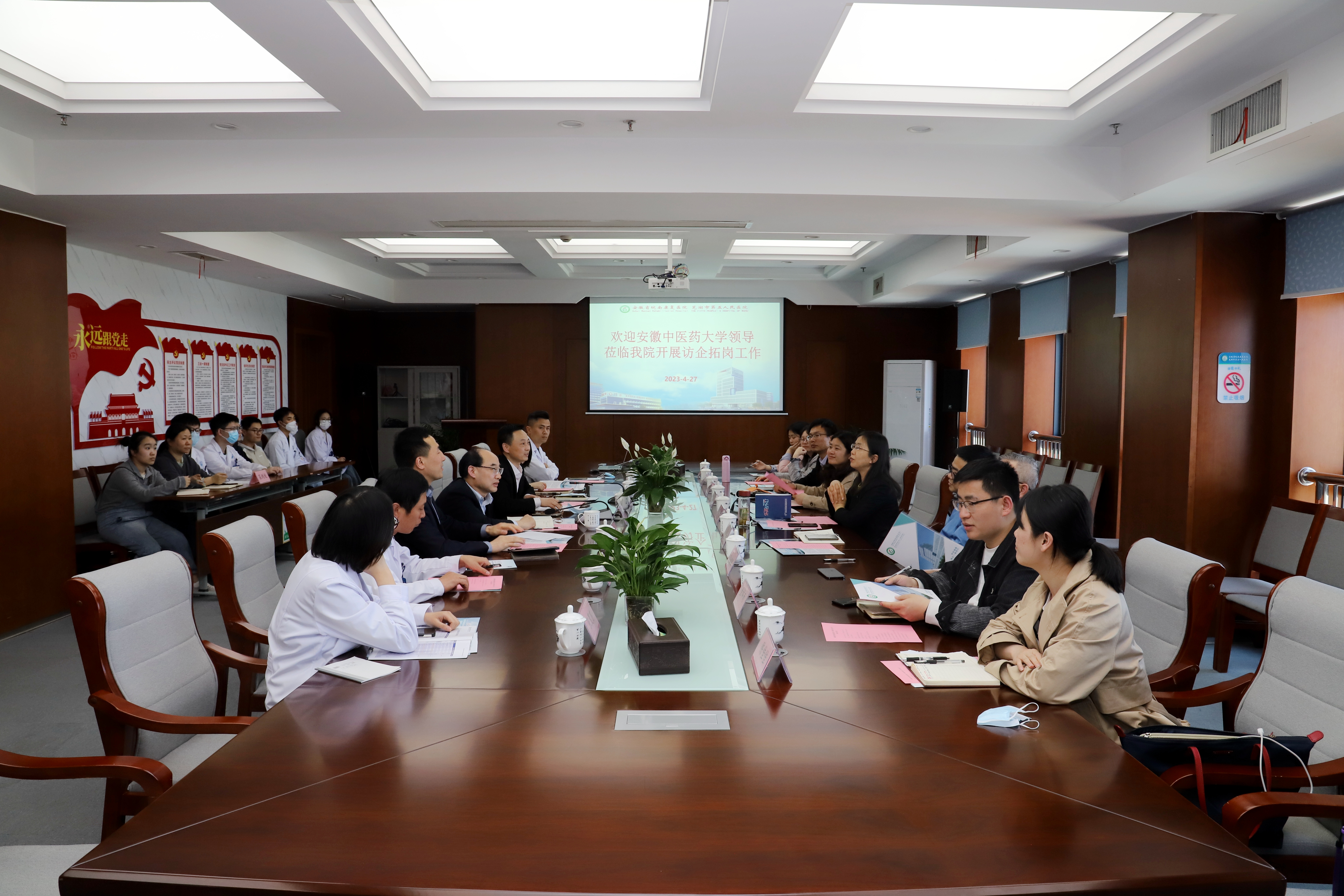 在来芜湖市第一人民医院医院副经理许艳首先对公司领导一行来医院开展调研工作表示欢迎,其次就医院参会人员进行了介绍。医院康复医学科主任纪红对医院发展历程、人才引进、康复医学科发展以及工作展望进行了介绍。唐巍首先对医院的热情接待表示感谢,其次分别介绍了英国365集团官网团队建设、专业设置、员工构成和中医临床实习实践,以及国家一流本科专业建设进展情况,并就公司与医院进一步加强联系和交流,切实结合双方优势,落实具体行动,为校院共建、深度合作打下坚实基础。