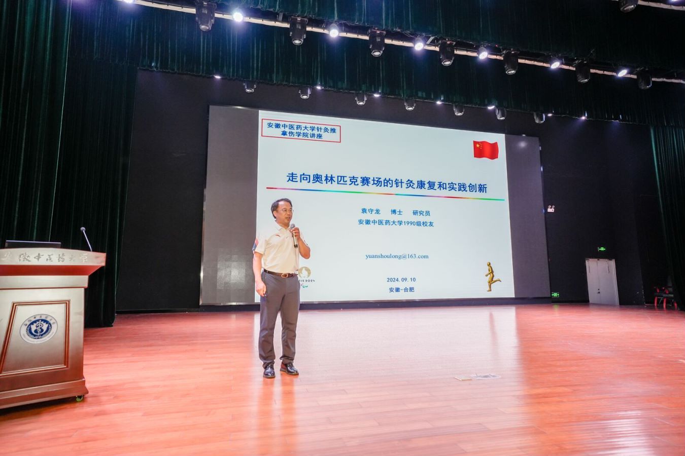 袁守龙为新生作《走向奥林匹克赛场的针灸康复和实践创新》的专题报告,鼓励同学们牢记习近平总书记嘱托,筑牢理想信念根基,锤炼过硬本领,努力成长为堪当时代重任的栋梁之才。他以第33届夏季奥林匹克运动会上中国奥运代表团取得的胜利故事为开篇,全面分享了针灸在奥林匹克赛场上运用的案例与感悟,从针灸治疗到体能康复训练等方面介绍针灸推拿、中医骨伤、中医康复、康复治疗学各专业在奥林匹克赛事中的独特优势,介绍了奥运会科技攻关理论探索和方法运用,同时对传统医学与主动健康提出思考与建议。他说:“中医针灸和其他西医的基础理论是学习的基础,是实践的基石,是未来人生的法宝,专业不仅要钻研,还要拓展,守正创新到开拓创新才能有新发展”。他幽默生动的报告方式,赢得全场阵阵掌声,为全体员工奠定了专业自信,明晰了未来多种发展方向。