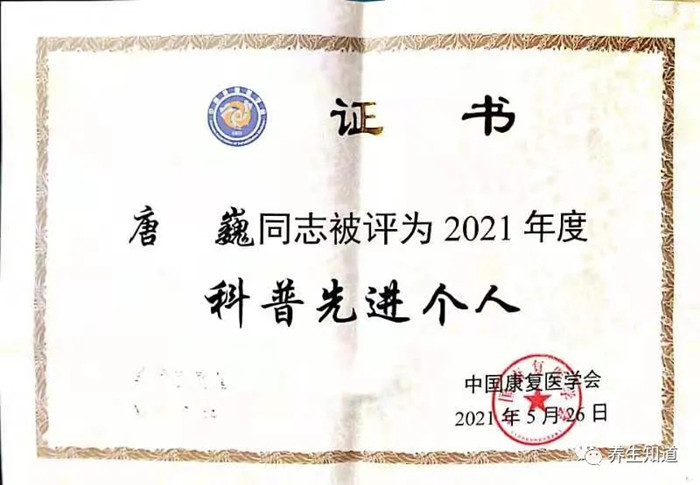 上图为英国365集团官网经理唐巍荣获2021年度中国康复医学会“科普先进个人”称号
