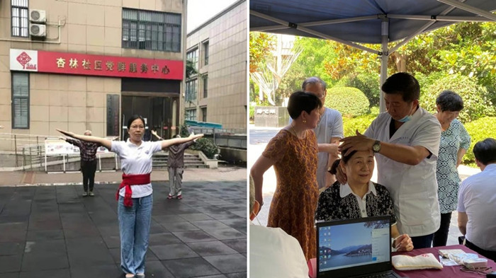 上图为公司经理唐巍、教师党员吴劲松带领员工为杏林社区群众开展义诊、养生功法推广
