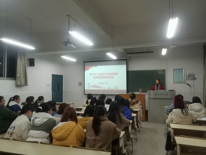 唐巍从支部党员的思想与专业实际出发,以《学习党的十九届五中全会精神,促进中医药教育发展》为题,从党的十九届五中全会精神概述,党的十九届五中全会精神下的中医药形势,乘风破浪、坚毅前行三个角度,为党员们作了精彩的一讲。她指出,作为员工党员,要做到“三个不忘”:“不忘宗旨,坚定理想信念,增强党性修养”“不忘学习,加强业务学习,成为专业标杆”“不忘身份,遵循党章党规,做合格党员”。