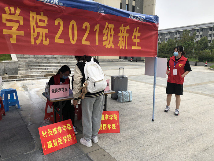 在迎新志愿者的引导下,新生陆续到达校老员工活动中心门口公司迎新服务点,然后在志愿者的带领和帮助下,到达公司一楼大厅公司迎新报到台报到并领取宿舍钥匙、一卡通等物品,最后,在志愿者的带领下,到达宿舍。