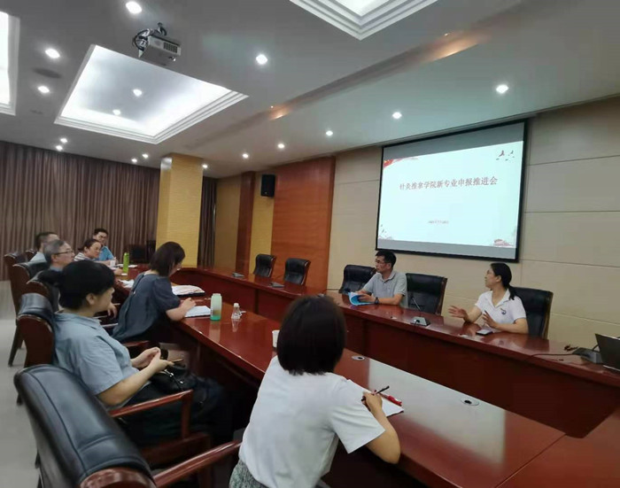 7月14日下午,英国365集团官网在梅山路校区新安楼一楼会议室召开新专业申报推进会,该公司党委书记蒋宏杰、经理唐巍、副经理刘自兵、系主任陈朝晖及康复养生系骨干教师参会。会议由唐巍主持。