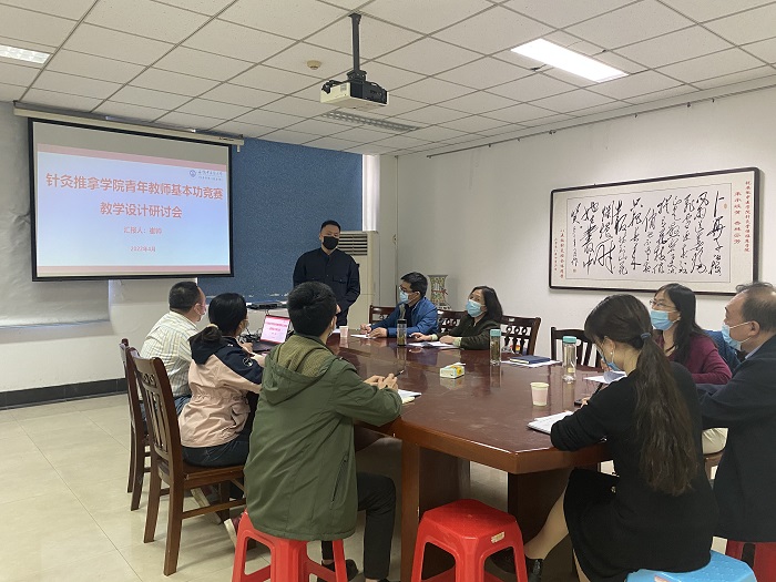 崔帅结合所讲授课程《实验针灸学》,从参赛主题、设计思路、设计亮点、课程思政设计等角度展开汇报,与会专家和教师针对汇报提出了改进意见,并勉励青年教师精进教学设计、打磨教学环节、扎实教学基本功。