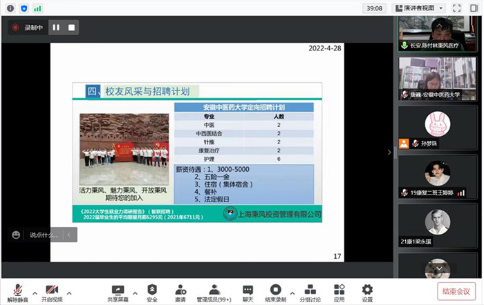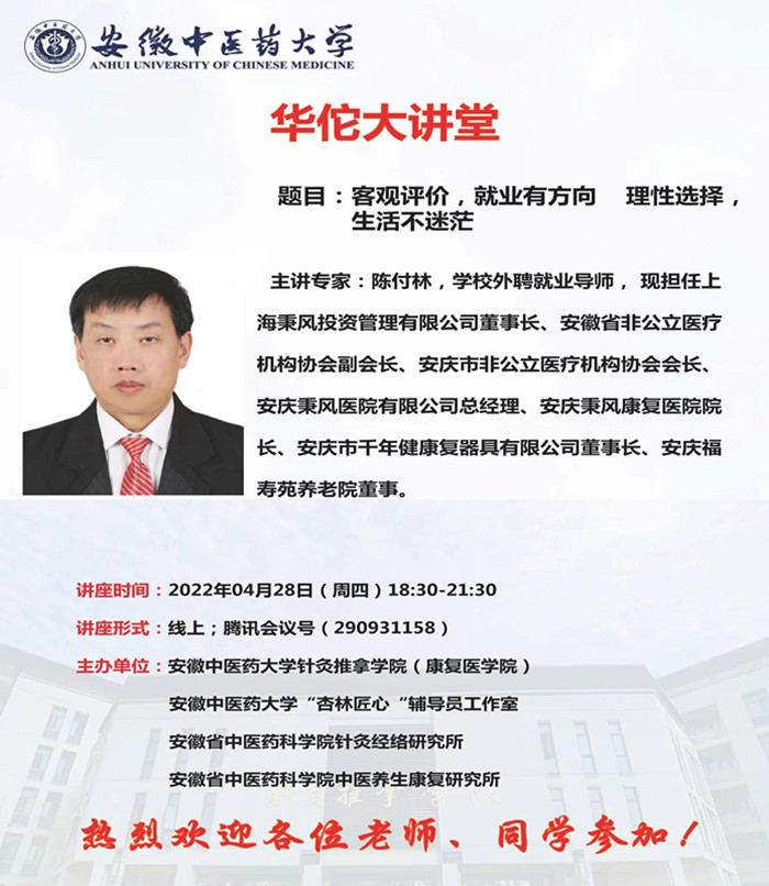 4月28日晚,公司举办第三期“华佗大讲堂”,邀请安庆秉风康复医院经理、公司外聘就业导师陈付林以《客观评价,就业有方向;理性选择,生活不迷茫》为题开展了线上讲座。该公司党政领导、“杏林匠心”工作室全体辅导员、“全国党建工作样板支部”教工第一党支部党员、公司师生近300人参加了本次讲座。该院康复养生系主任陈朝晖主持。