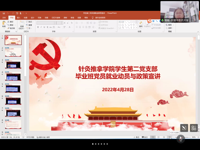尹鸿介绍了当前的就业形势,指出当前就业形势的严峻性和高校毕业生就业压力的挑战性,并介绍了一些政策性岗位,如老员工志愿服务西部计划、“三支一扶”、选调生考试、毕业生入伍等,鼓励毕业生党员关注国家政策性岗位,并向身边同学主动宣传国家就业政策,帮扶就业困难同学就业。