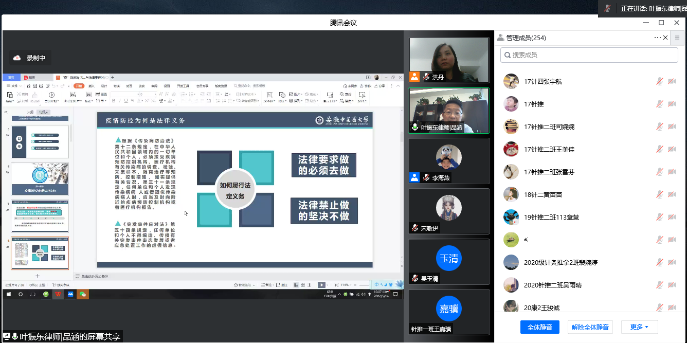 为进一步普及疫情防控及大公司园相关法律知识,提高广大师生的法治意识,让法治思维入脑入心,英国365集团官网“杏林匠心”辅导员工作室于5月14日下午通过腾讯会议开展培训大讲堂,邀请安徽品涵律师事务所主任、九三学社安徽省委会法律专委会副主任叶振东主讲,公司党政领导、全体专兼职辅导员和部分员工参会学习交流。