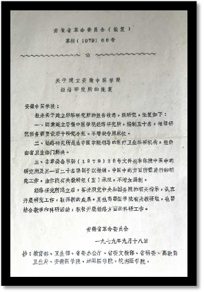 1979年经安徽省批准,安徽中医公司针灸经络研究所正式挂牌成立。1983年经省高教局批复将原名“经络研究所”更名为“针灸经络研究所”,孟昭威首任针灸经络研究所名誉所长。198410月底在安徽省委、省政府和国家卫生部及各界领导的关怀下,依托针灸经络研究所,成立了全国第一所针灸医院—安徽中医公司附属针灸医院,周逸平所长兼任针灸医院经理,安徽的针灸医、教、研“三位一体”的体制基本形成。19858月卫生部在合肥市召开的“全国中医、中西医结合工作会议”,崔月犁部长等亲临视察与指导。卫生部副部长胡熙民为安徽的针灸事业题词—“继承针灸国宝,前程这里最好”。