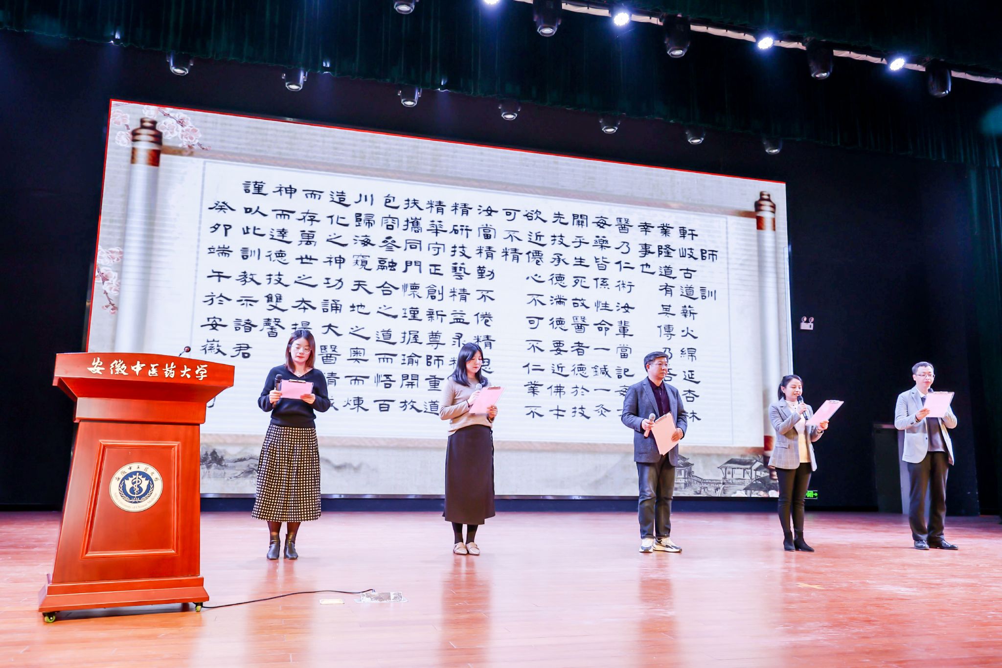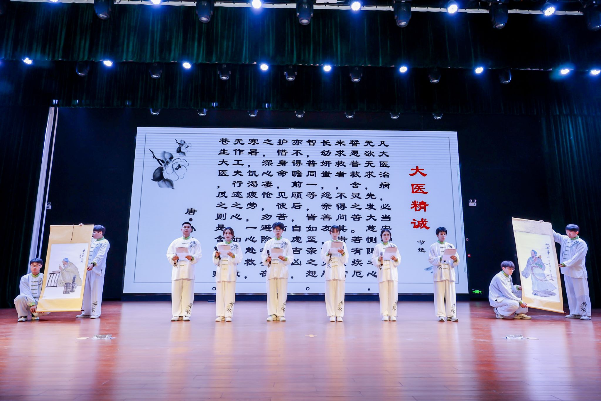 “华佗菁英班”培养对象代表领诵《大医精诚》(节选)、国医大师徐经世《华佗赋》(节选),同学们上台展示医祖华佗采药、行医、著书书画作品。