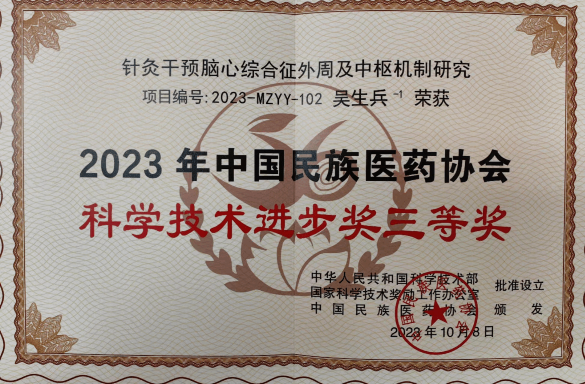经脉脏腑相关安徽省重点实验室的两项科研成果“贺氏针灸器械学术流派挖掘整理及传承传播”“针灸干预脑心综合征外周及中枢机制研究”分别荣获2023年中国民族医药协会科学技术奖一等奖、三等奖。